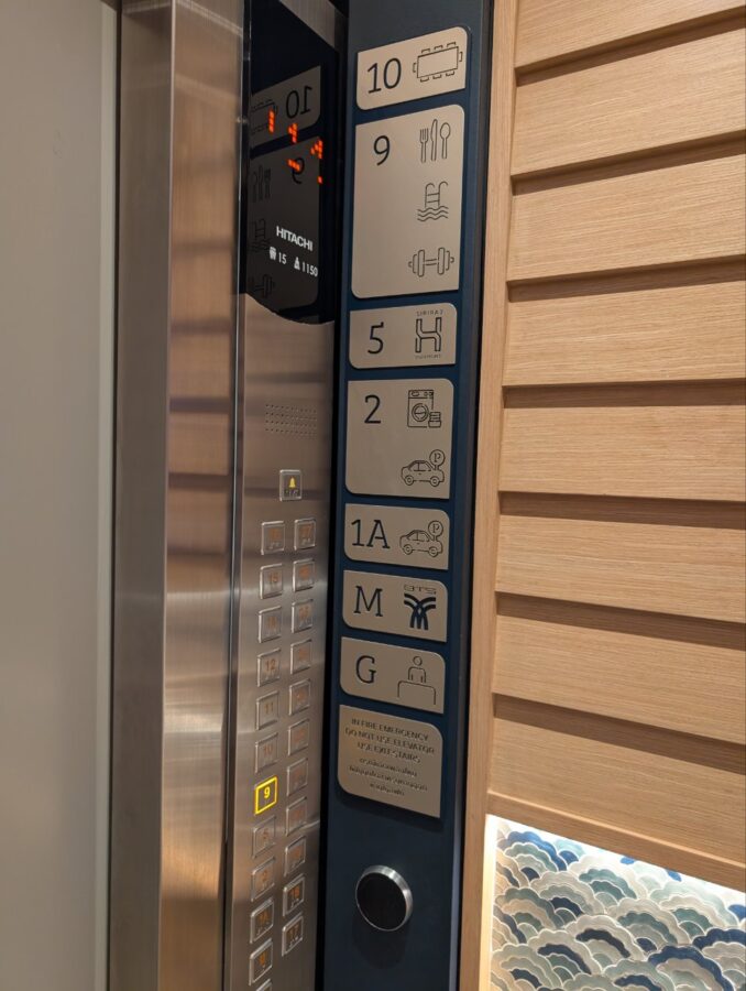 エレベーター内には各階の案内があり、ホテルの施設が一目で分かります。9階のプールやレストランへのアクセスも簡単でした。