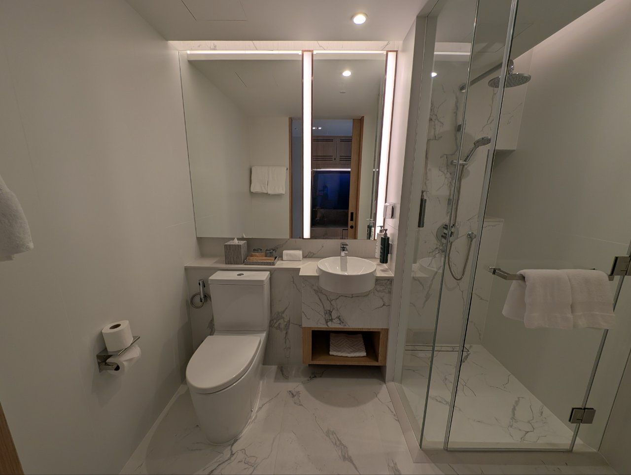 入口左手のバスルームは、清潔感のあるモダンなデザインでした。