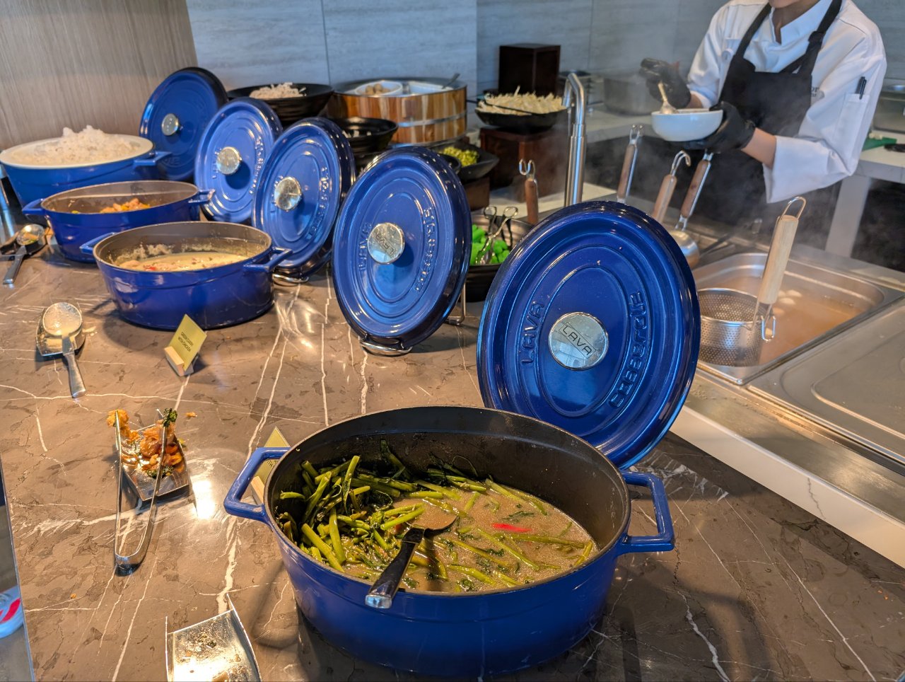 ヌードルバーでは、麺の種類や具材を自分で選び、シェフが目の前で調理。スープの辛さやトッピングを選べるカスタマイズ性が魅力で、できたての香りが食欲をそそります。