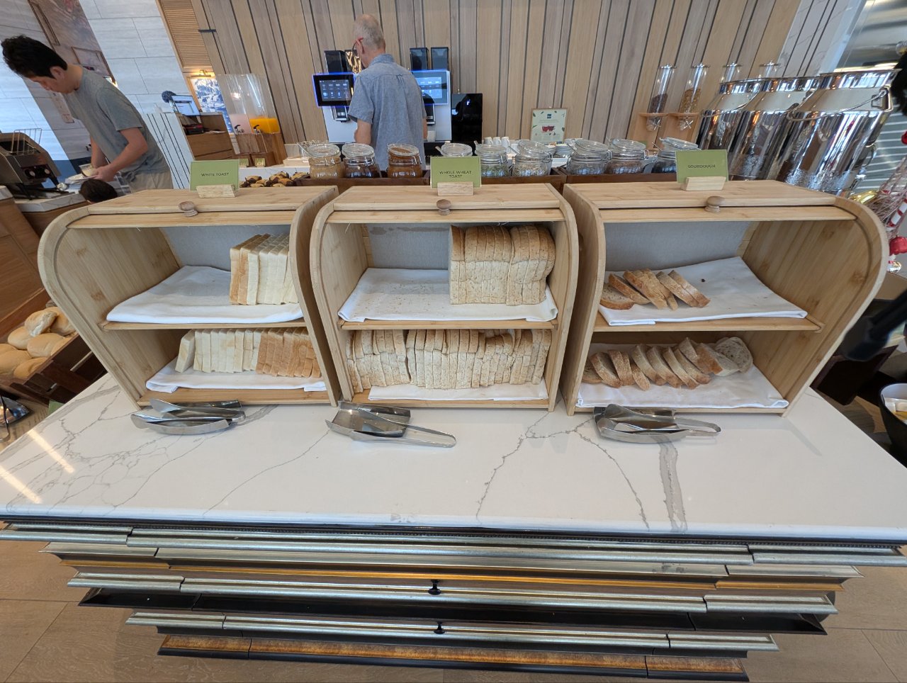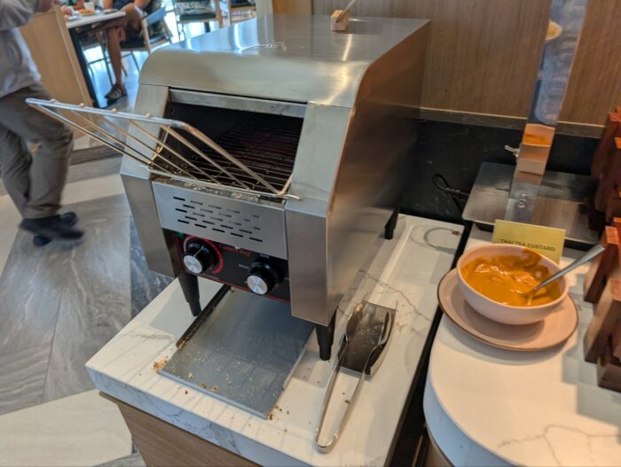 パン・シリアルコーナーは、朝食の軽い選択肢として充実。トースター横にはクロワッサンやデニッシュ、ワッフルが並び、焼きたての香りが漂います。