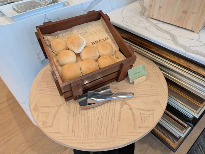 ソフトロールはふわっとした食感で、シンプルな朝食に最適。隣にバターやマーガリンが用意されています。