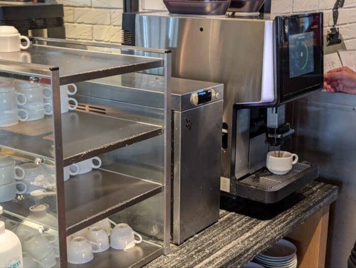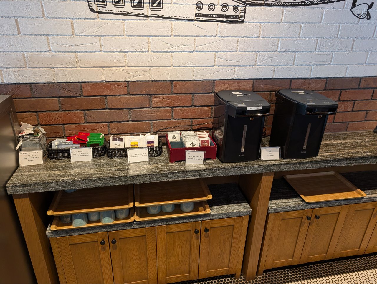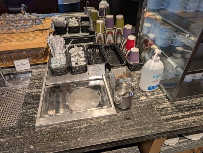 ここに持ち帰り用の紙コップが用意されています。部屋に戻って飲めるのは落ち着けて良いですね。