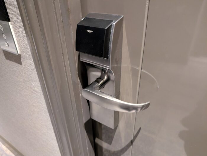 カードキーをタッチして部屋に入ります。セキュリティ面でも安心です。