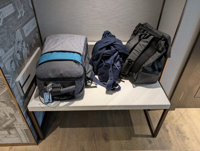 部屋に入って左手に荷物置き場があります。スーツケースを広げるのに便利なスペースです。
