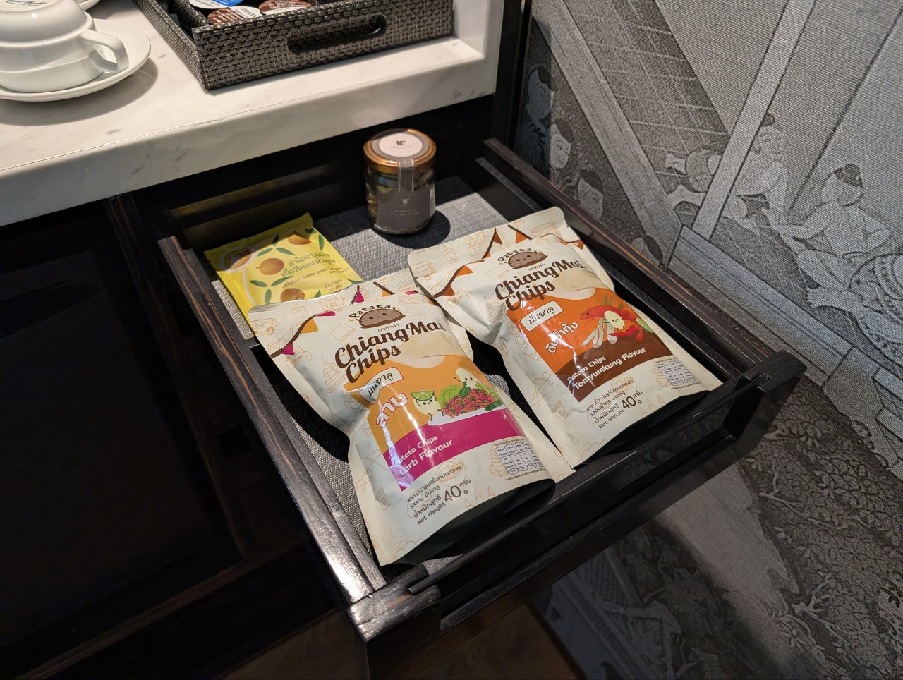 冷蔵庫横の引き出しの上段には各種スナックが入っています。夜食にも便利です。