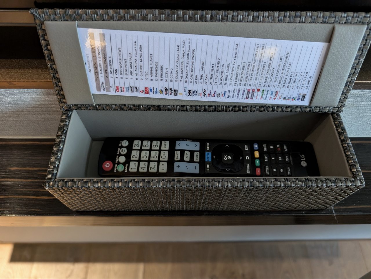 大型テレビの下のボックス内にリモコンがあります。操作が簡単で使いやすいです。