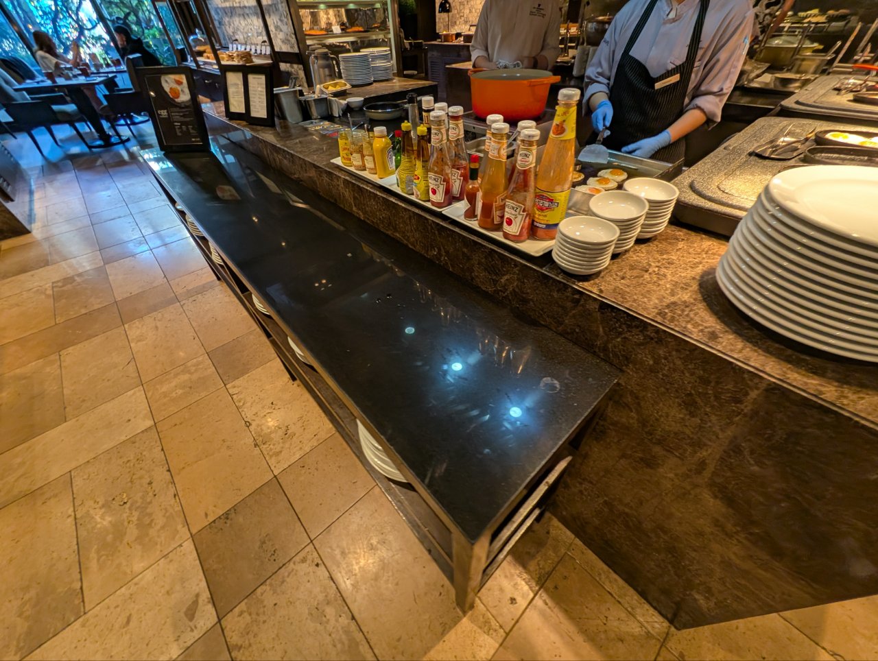 ライブキッチンの活気ある雰囲気や、グルテンフリーやハラル対応の配慮、フルーツやアイスのデザートコーナーまで、どのコーナーも満足度が高く、連泊しても新しい発見があります。