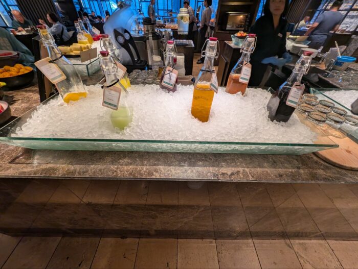 フレッシュジュースコーナーでは、スイカやパイナップルをその場で絞ったジュースが提供されています。新鮮な果汁の甘みが、朝食をさらに特別なものにします。