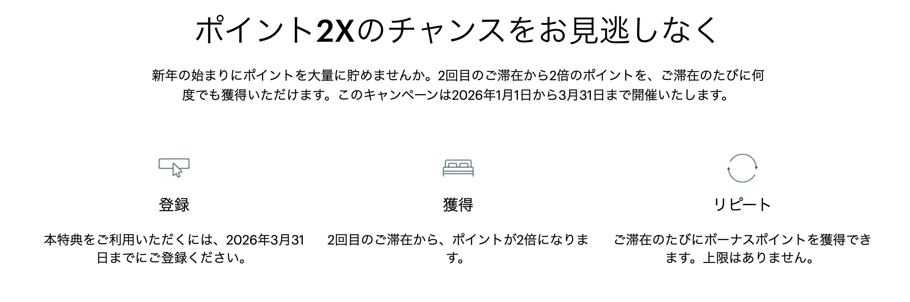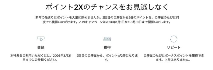 ポイントがどんどん貯まる新年のスタートを切りましょう。2回目のご滞在から2倍のポイントを、ご滞在のたびに何度でも獲得いただけます。このキャンペーンは2026年1月1日から3月31日まで開催いたします。